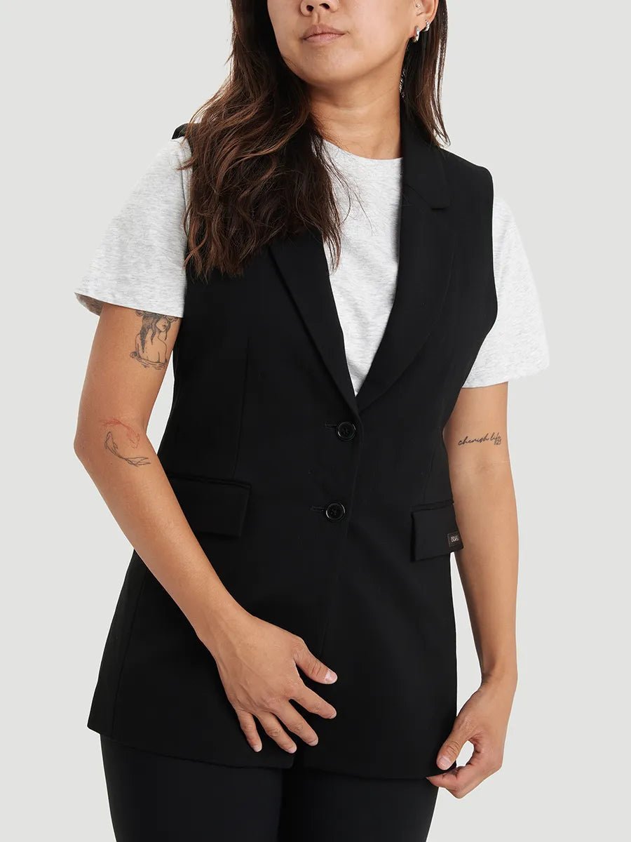 This exceptional-quality black sleeveless blazer is perfect for layering over a long-sleeved sweater or T-shirt. Easy to pair with jeans, leggings, or dress pants, it works just as well for elegant evenings as it does for casual occasions. A fashionable must-have for your wardrobe that blends style, comfort, and contemporary flair.