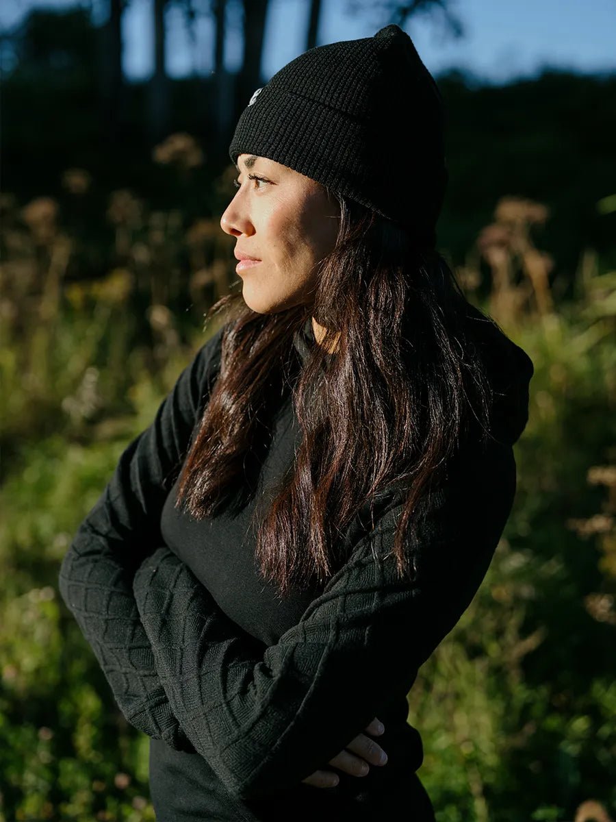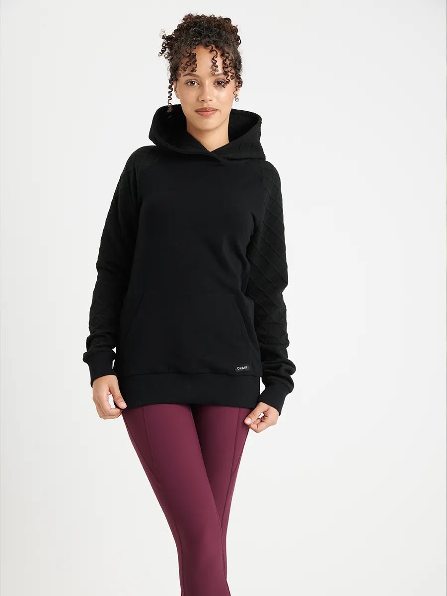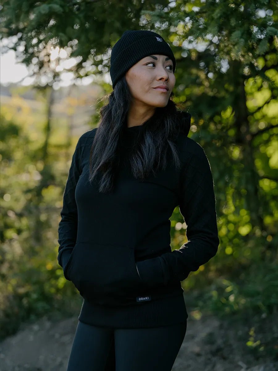 We know you love blending fabrics as much as we do. That's what inspired us to create this black hooded tunic with contrasting accents. Knitted sleeves and fleece body: this combo of textures highlights black, a timeless color we adore.