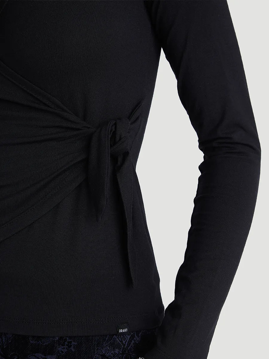 A timeless, feminine, and elegant black modal wrap top. Its perfectly tailored cut flatters the figure and subtly reveals your femininity. Classic yet bold, this piece is perfect for those who love to stand out with confidence and style.
