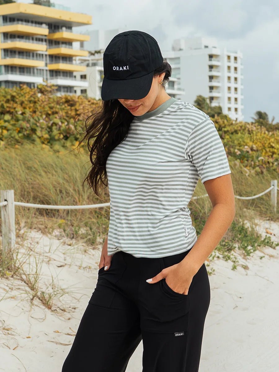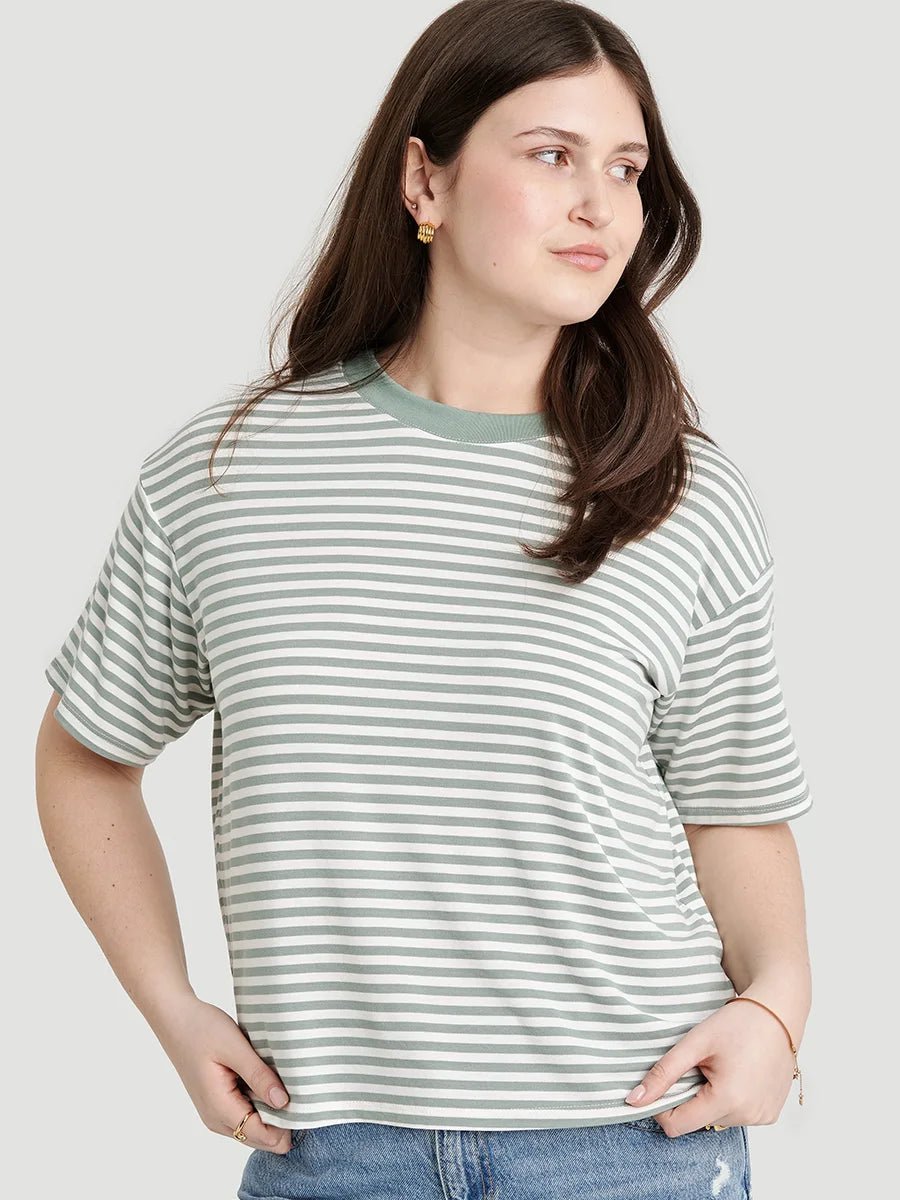 This casual T-Shirt is perfect for everyday wear! (CYNTHIA APPROVED!) It’s made from a soft and stretchy medium-weight modal jersey fabric that’s not overly hot. Available in a striped sage-colored pattern.